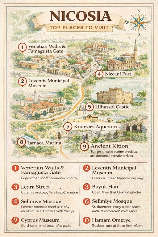 Start inicosia → Drive south to Limassol → Explore Paphos → Head east to Ayia Napa Return via scenic coastal roads