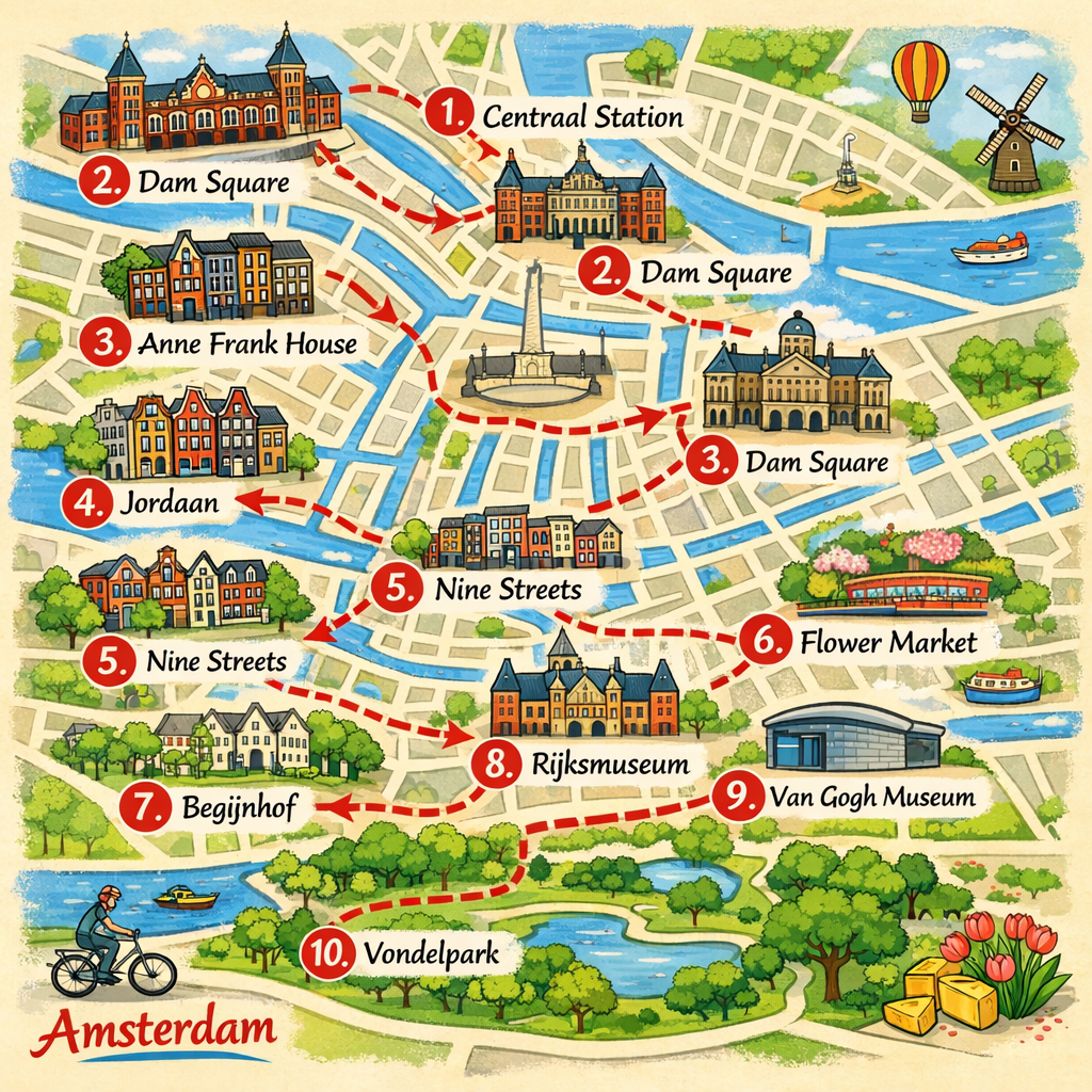 - Day 1: Explore Rijksmuseum, Van Gogh Museum, stroll through Vondelpark.